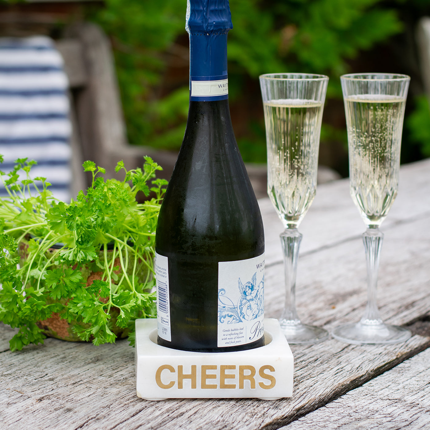 Add a splash of celebration to your home with the Culinary Concepts Cheers Marble Bottle Holder. Featuring a sleek marble base highlighted by a charming brass inlay engraved with "Cheers" in elegant script, this piece combines style and practicality. Perfect for entertaining or gifting, it brings a playful yet timeless touch to your living or dining space.