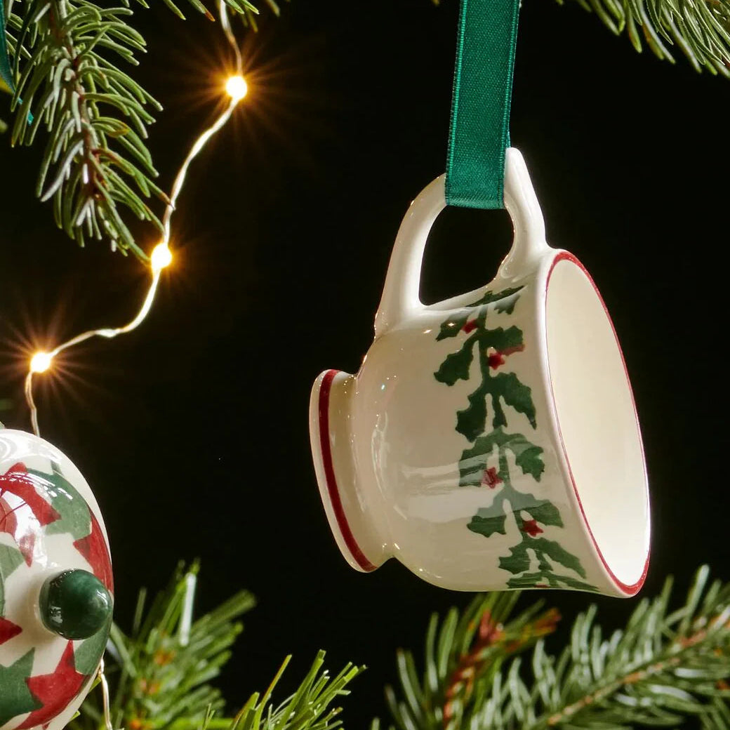 This miniature teacup brings festive charm to any Christmas display. Hand-decorated with bold, vibrant holly and berries, it delivers striking seasonal impact despite its diminutive size. Perfect for creating a decorative mantelpiece arrangement or hanging as a tree ornament using the attached red ribbon. Part of Emma Bridgewater's collectible tiny range, it coordinates beautifully with matching miniature plates and mugs to build a cohesive festive scheme. Presented in a gift box, making it an ideal present for collectors and those seeking distinctive holiday décor.