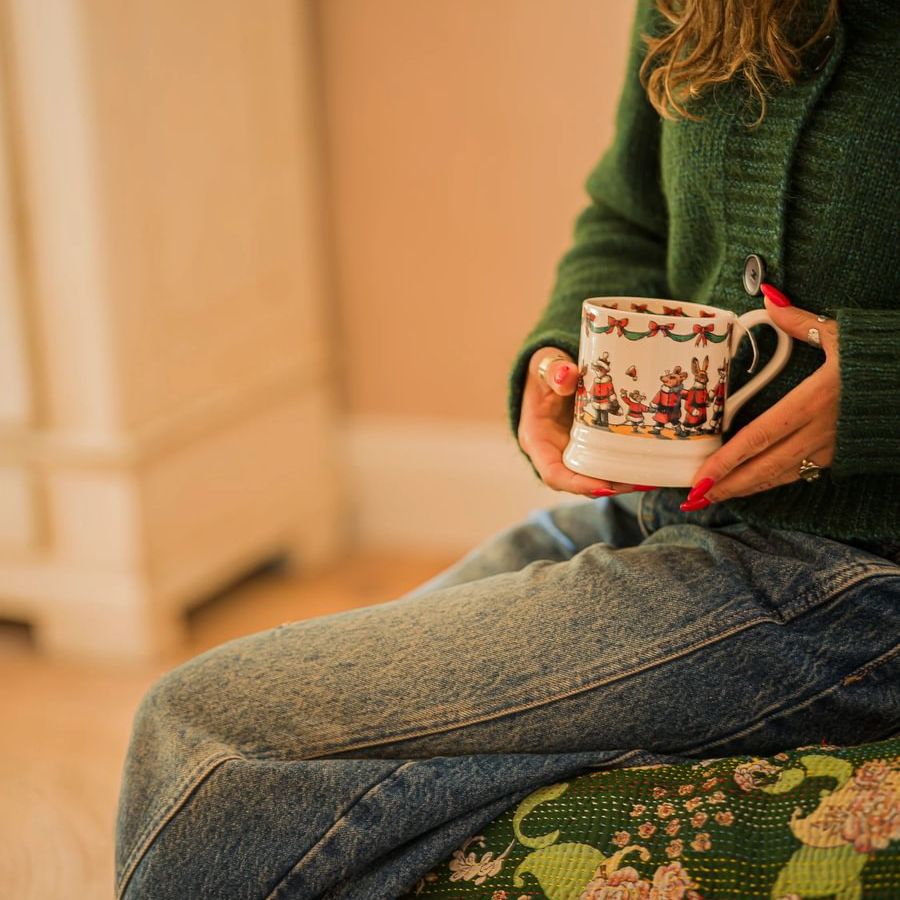 This charming Emma Bridgewater half pint mug transforms hot chocolate time into a festive adventure with its whimsical woodland characters dressed as Father Christmas. Featuring foxes, badgers, and rabbits in full Santa regalia, the design sparks imagination and delight in young drinkers. The generous half pint capacity makes it ideal for warming beverages topped with marshmallows or chocolate shavings after winter outdoor play. Hand-sponged with meticulous attention to detail, this mug combines practical functionality with storytelling artistry, making it a treasured addition to seasonal celebrations and everyday winter moments alike.