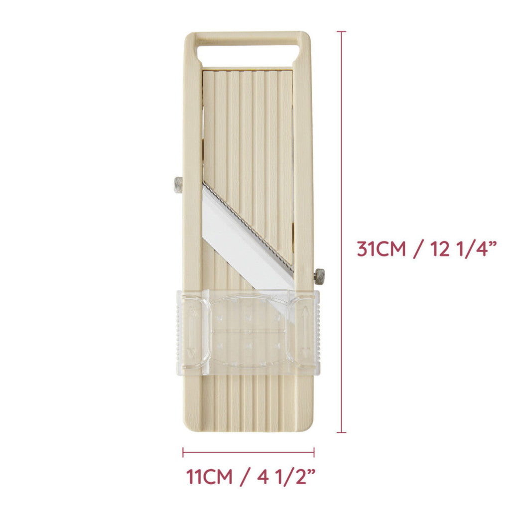 The perfect precision cutting tool, this authentic Japanese slicer includes three blades and a safety guard. With adjustable thickness to tackle a range of jobs, this super sharp mandolin comes with a straight blade and a fine and course julienne blade.