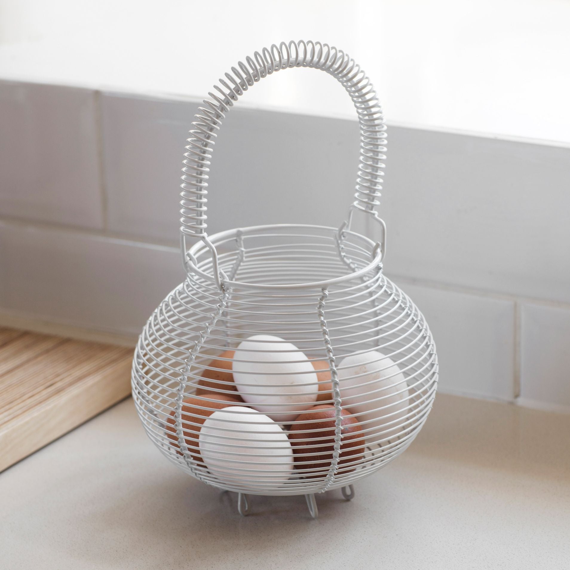 Wirework egg basket in a choice of colourways, striking when filled with pale white eggs. The neutral tones suit darker urban kitchens and crisp white surfaces alike. This classic French-inspired design brings contemporary style to any space, making it an ideal housewarming gift. Impressively sturdy with four feet and a carry handle, it transitions effortlessly from chicken coop to kitchen. Hold up to 16 free-range eggs on your counter, ready for breakfast — or display it as functional kitchen décor that complements both rustic and modern interiors.