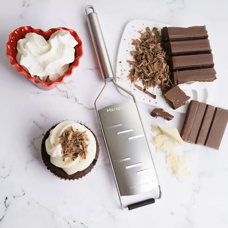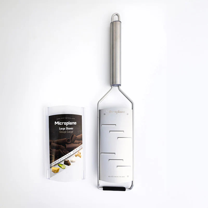 The Microplane Professional Large Shaver features six long, razor-sharp blades that effortlessly create broad, elegant strips of chocolate, carrots, cheese, truffle, butter, and more. Perfect for producing visually striking garnishes, this tool adds both flair and finesse to your culinary presentations with ease and precision. The Microplane Professional Large Shaver combines elegant, minimalist design with durable stainless steel construction. Its superior photo-etched blade—made in the USA—ensures precise, effortless cutting without crushing, preserving the natural aroma and flavor of your ingredients. Ideal for creating broad, refined shavings of chocolate, cheese, vegetables, and more with professional-quality results.