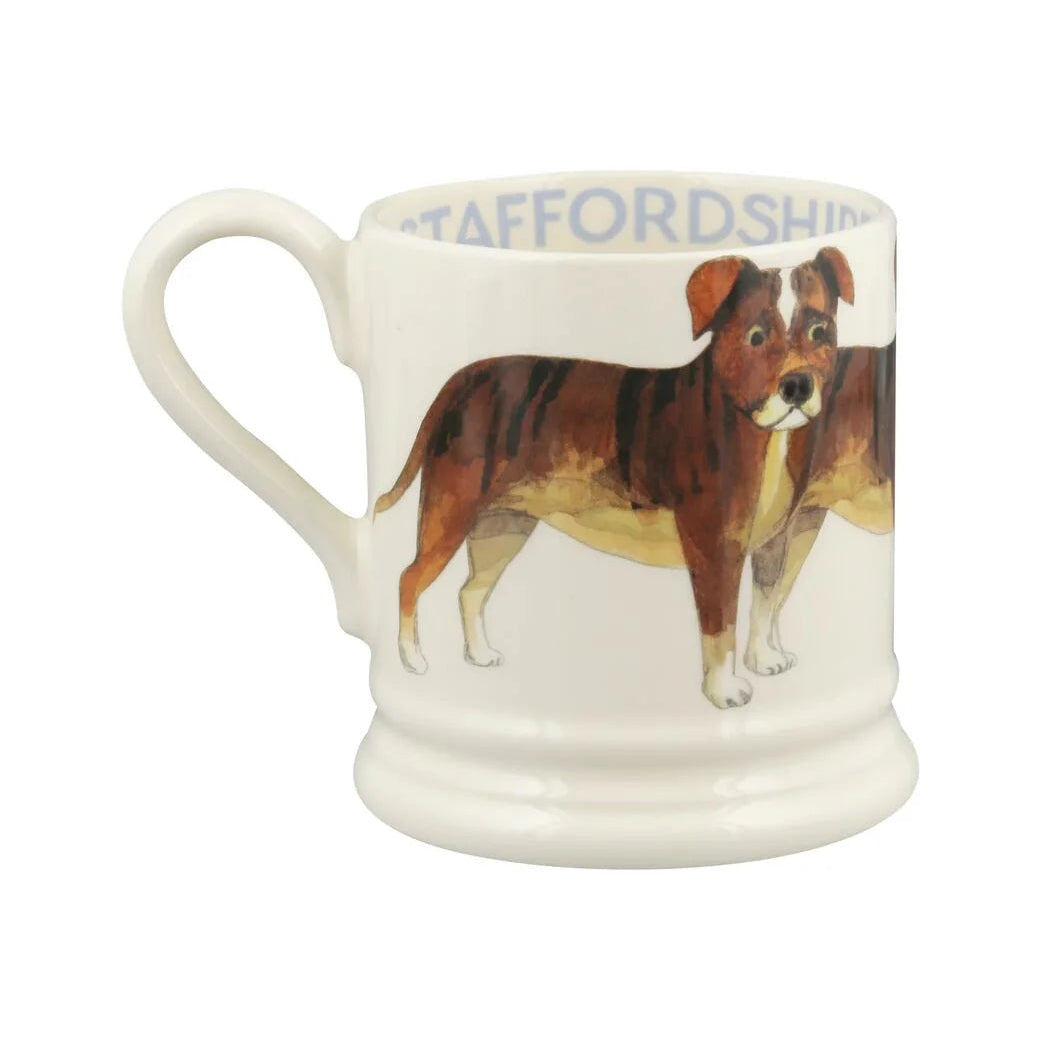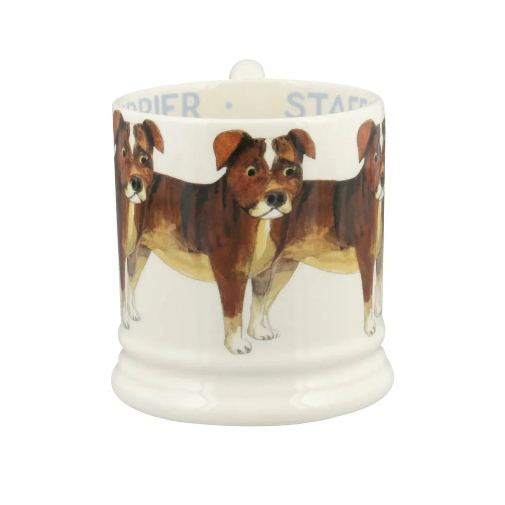 Celebrate local heritage with this distinctive Emma Bridgewater Staffordshire Bull Terrier Half Pint Mug, crafted right here in Stoke-on-Trent, Staffordshire. Featuring the spirited breed that shares the county's name, this mug captures the Staffy's most endearing qualities—their keen intelligence, good nature, and enthusiastic charm. Hand-crafted with Emma Bridgewater's renowned artistry, it's a fitting tribute to a beloved dog breed known for strength, agility, and unwavering friendliness. Perfect for Staffordshire Bull Terrier devotees and those who appreciate the pride of local pottery craftsmanship. A clever creation that honours both the breed and its namesake county.
